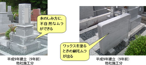 石材店によっては、水がしみやすい石材にワックスを塗り水がしみないとして販売される方もいます。しかし本来お墓というものは、自然の石だけで成り立っており、その石に魂が宿り、お墓として成り立つものであるため、あえてワックスを塗り水をしみさせないというのはどうかと思います。またワックスというのも半永久的なものではないため、いつかははがれ、見苦しい水しみ跡が残るのも寂しいことではないかと思います。